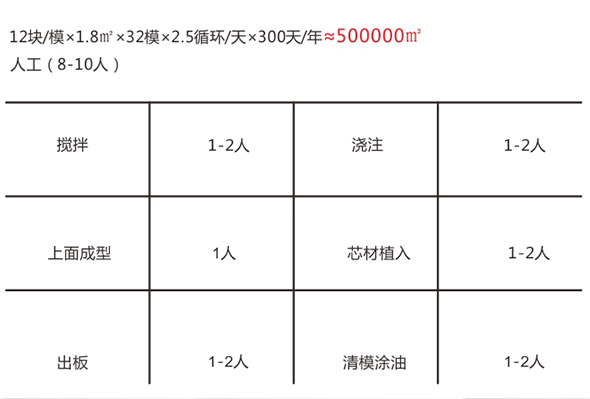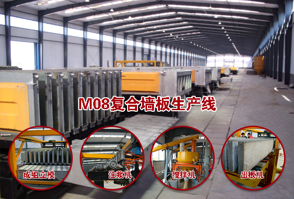 M08復合墻板生產線主要設備組成有:集約式低能耗養護室、第三代成組立模、立;剞D機、上抹面成型機、第三代液壓抽芯機、壓力注料系統、合板翻板機構、推板機構,標準生產線產能年產達50萬㎡(2440mmX610mm)。