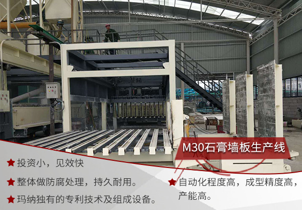 M30型石膏條板生產線是在國外石膏墻板生產工藝基礎上,創新研發成功的石膏板生產設備,標準產能為50-100萬㎡,可生產磷石膏、硫石膏、天然石膏等為原料的空心條板。