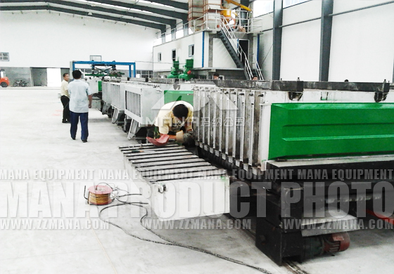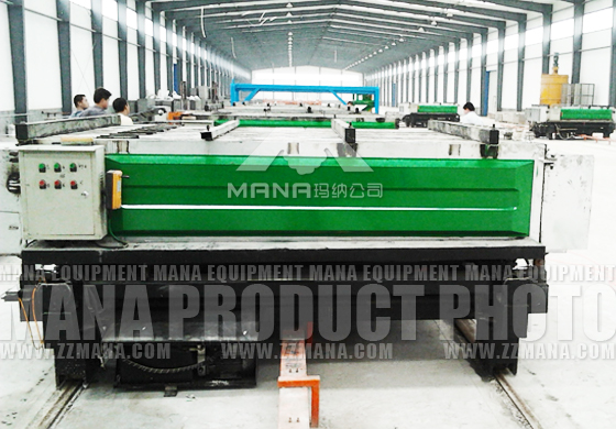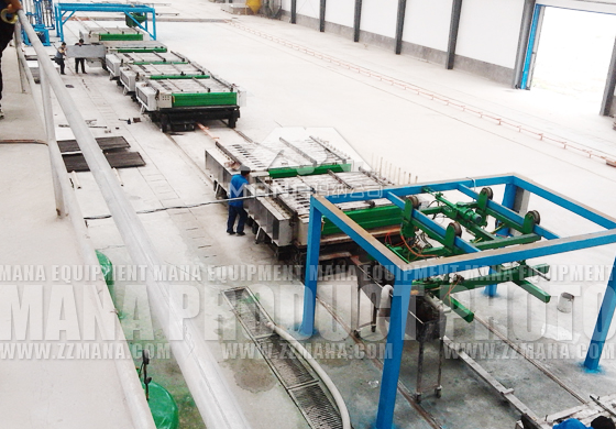 - 5)出板系統(tǒng):等養(yǎng)護(hù)完成后,自動行走至出板機(jī)構(gòu)工位,液壓開模,再由出板機(jī)把成型板推出,以供打包。